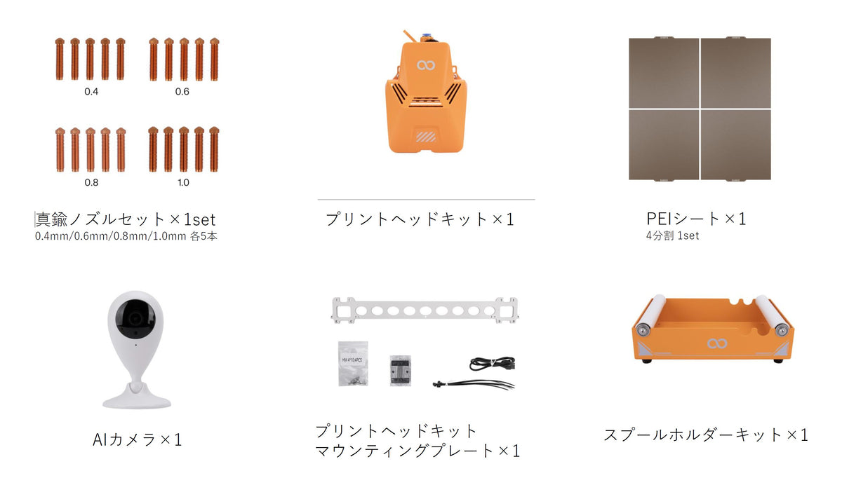 ヘッド数/ヘッド径 | 1/0.4mm | 1/0.4mm | 1/0.4mm | 1/0.4mm | 1/0.4mm | 1/0.4mm | 1/0.4mm | 1/0.4mm | 1/0.4mm | 1/0.4mm | 1/0.4mm | 1/0.4mm(オプション0.2/0.8/1.2mm) | 1/0.4mm 銅合金製ノズルキット 焼入れ鋼製ノズルキット |