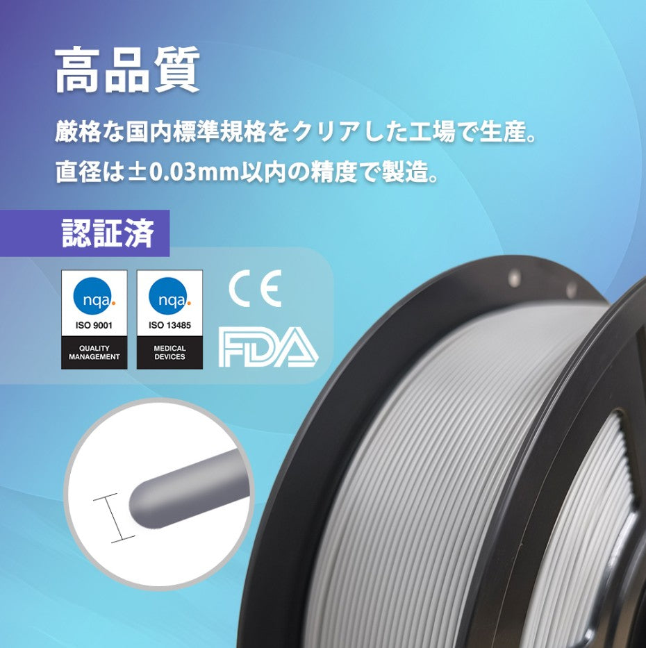 精密な造形を可能にする±0.03mmの直径精度と、優れた耐久性・柔軟性で、試作から最終製品まで幅広く対応。色展開も豊富で、表現の幅が広がります。